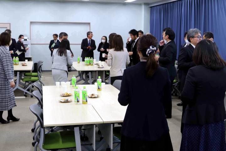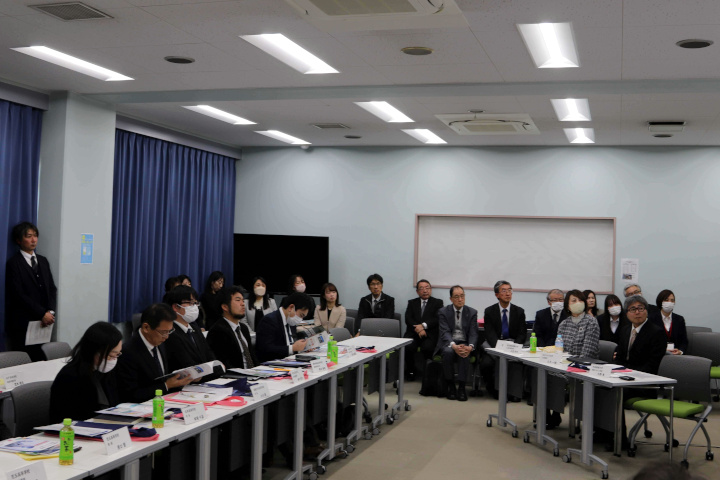 発表会に続いて、本学107教室にて「高大連携交流会」が催され、招待した近隣の高校の校長および教職員の方々、三大学の学長および教職員が出席いたしました。招待者に向け、各大学の担当者より入試や大学の特徴などに関して説明があった後、会場を105教室に移し懇親会が行われました。