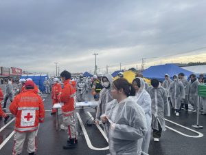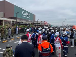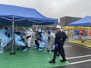 11月17日(金)13時~15時に「令和5年度埼玉県・加須市国民実動訓練」がカインズ大利根店にて行われ、本学「加須市学生消防団」に所属する学生や、公務員を志す学生など18名が参加しました。民間の商業施設では14年ぶりに行われ、大野元裕埼玉県知事、角田守良加須市長をはじめ、消防、警察、自衛隊、病院関係者など約500名が訓練に臨みました。カインズ資材館にサリンが撒かれたという設定にて、本学学生は衣服および靴の除染作業や、軽傷者としてトリアージを受ける訓練を行いました。
