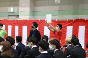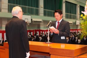 体育館アリーナに新入生と教職員、そして保護者の皆さんが一同に会して行われるのは4年ぶりとなります。柏木俊彦学長からの式辞、来賓からの祝辞が述べられ、新入生代表が入学の宣誓を力強く行いました。
