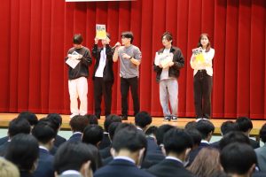 入学式終了後、先輩たちによる新入生歓迎会が行われました。ダンス部のパフォーマンスから始まり、各サークルの紹介、最後は全員でゲームを行い、大いに盛り上がり、親睦を深めました。
