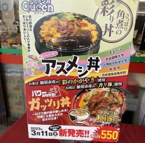 「アスメシ丼」とは、本学女子硬式野球部がレシピのアイデアで協力、加須市、花咲徳栄高校、人間総合科学大学と共同開発したものです。スーパーまるたけ騎西店ほかで販売しています。美味しいので是非食べてくださいね。