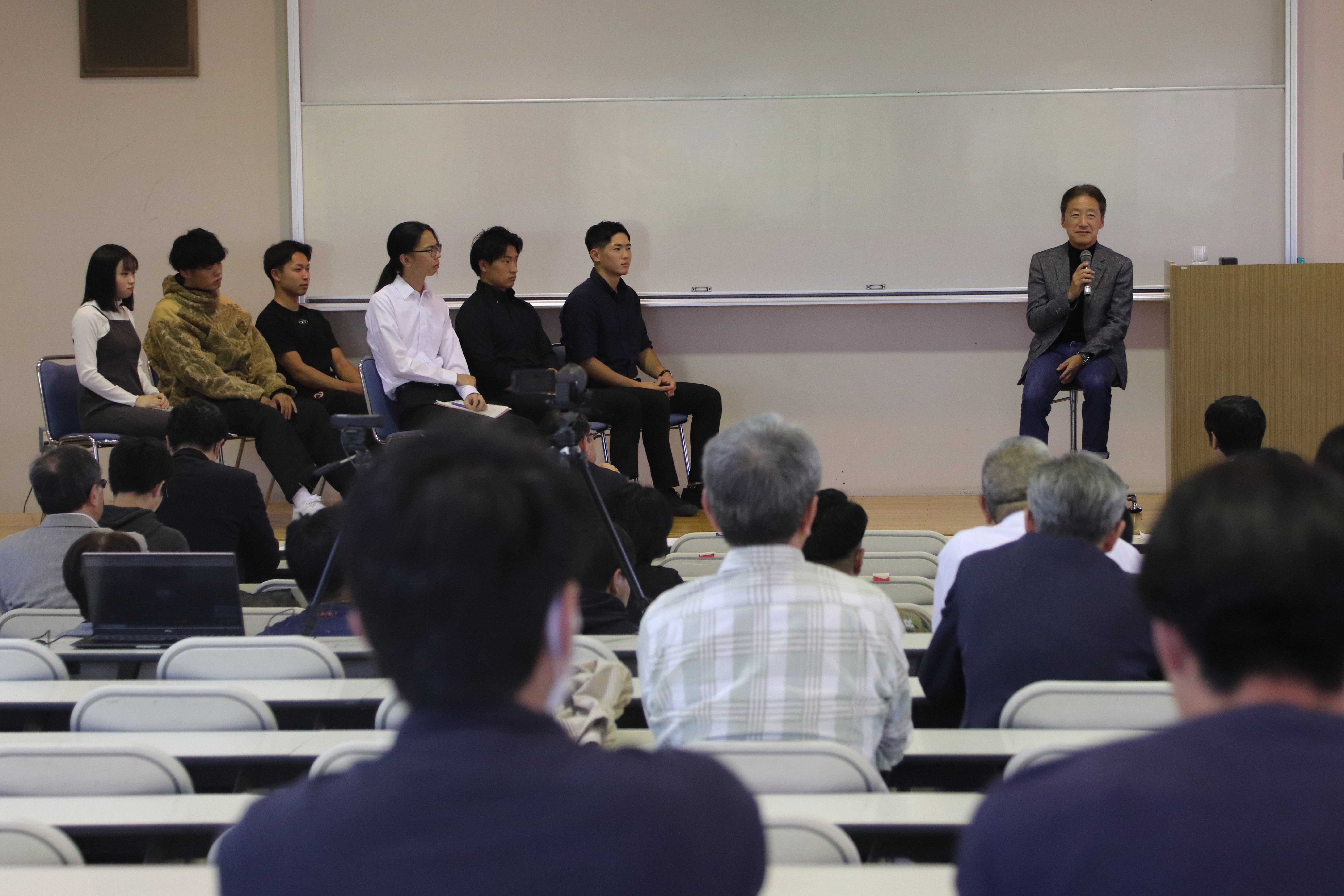教職員、学生の他、近隣住民の方も大勢参加し、現役経営者からの貴重なお話しを、うなずきながら聞いていました。