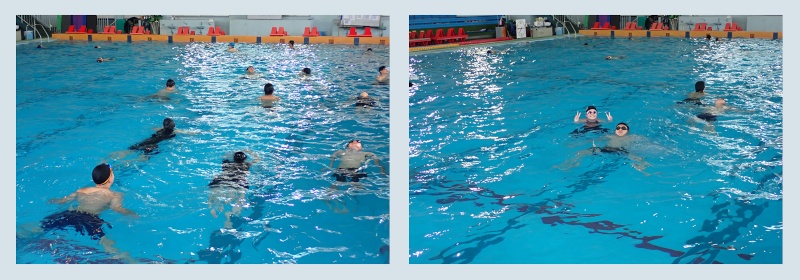 1時間泳は,実技試験の最終種目となります。1時間,床に足もつかず,壁に手もつかずプールを周りながら泳ぎ続けます。オーソドックスに平泳ぎをする者,楽に呼吸を確保するために背浮きバタ足をする者など,泳ぎ方は人ぞれぞれです。自分の身を水中で安全に移動するためのスキルを身につけていきます。水泳の極意である「浮力」をいかにうまく使って,楽に泳ぎ続けるかが完泳の決め手となります。水に沈むと「浮力」の影響で浮き上がる,呼吸をするために顔を上げると「重力」の影響で沈むを体験することができます。まさに教員(保健体育)になるための登竜門ですね。