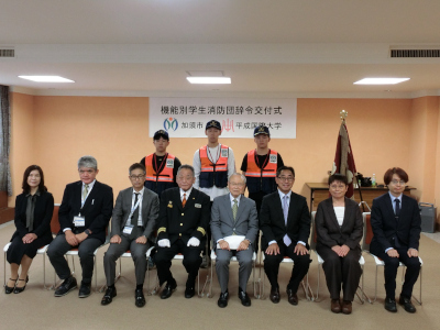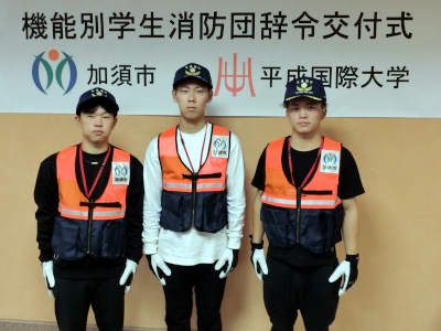 令和7年(2025年)10月16日(木)、本学迎賓特別ルームにて、令和7年度加須市機能別学生消防団辞令交付式が挙行されました。 今年度より新たに学生消防団に入団するのは、3名の男子学生(法学部1年)です。 新入団員を代表し、笠原怜さんが決意表明を行い、地域社会への貢献に対する強い意欲、入団の喜び、早期戦力化への決意が述べられました。