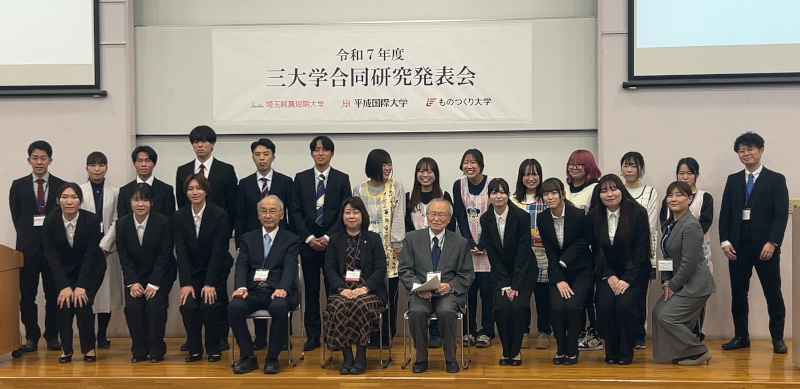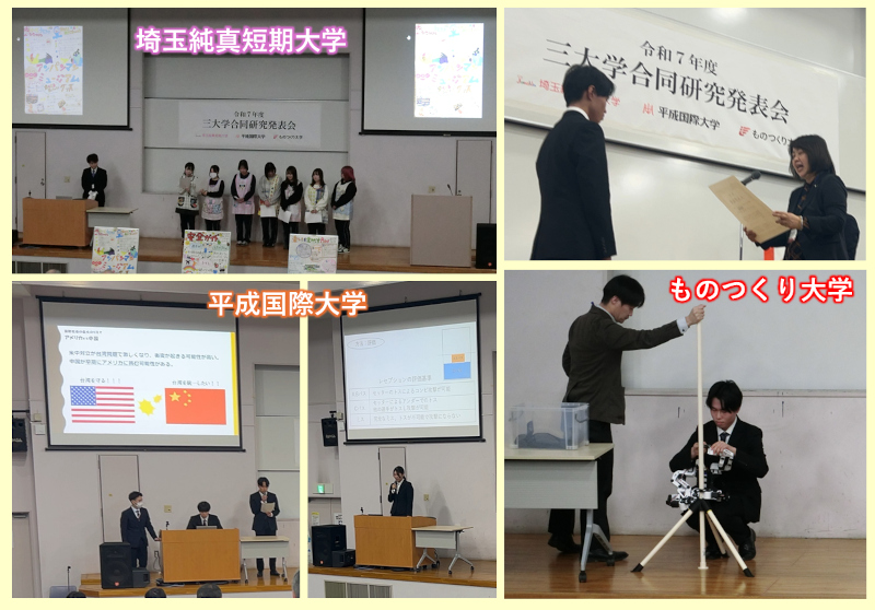 令和8年(2026年)2月10日(火)、「令和7年度三大学合同研究発表会」が本学102教室にて開催されました。本発表会は、平成30年(2018年)11月9日に締結された「埼玉純真短期大学、平成国際大学及びものつくり大学の連携協力協定」に基づき開催されており、今回で第7回となります。