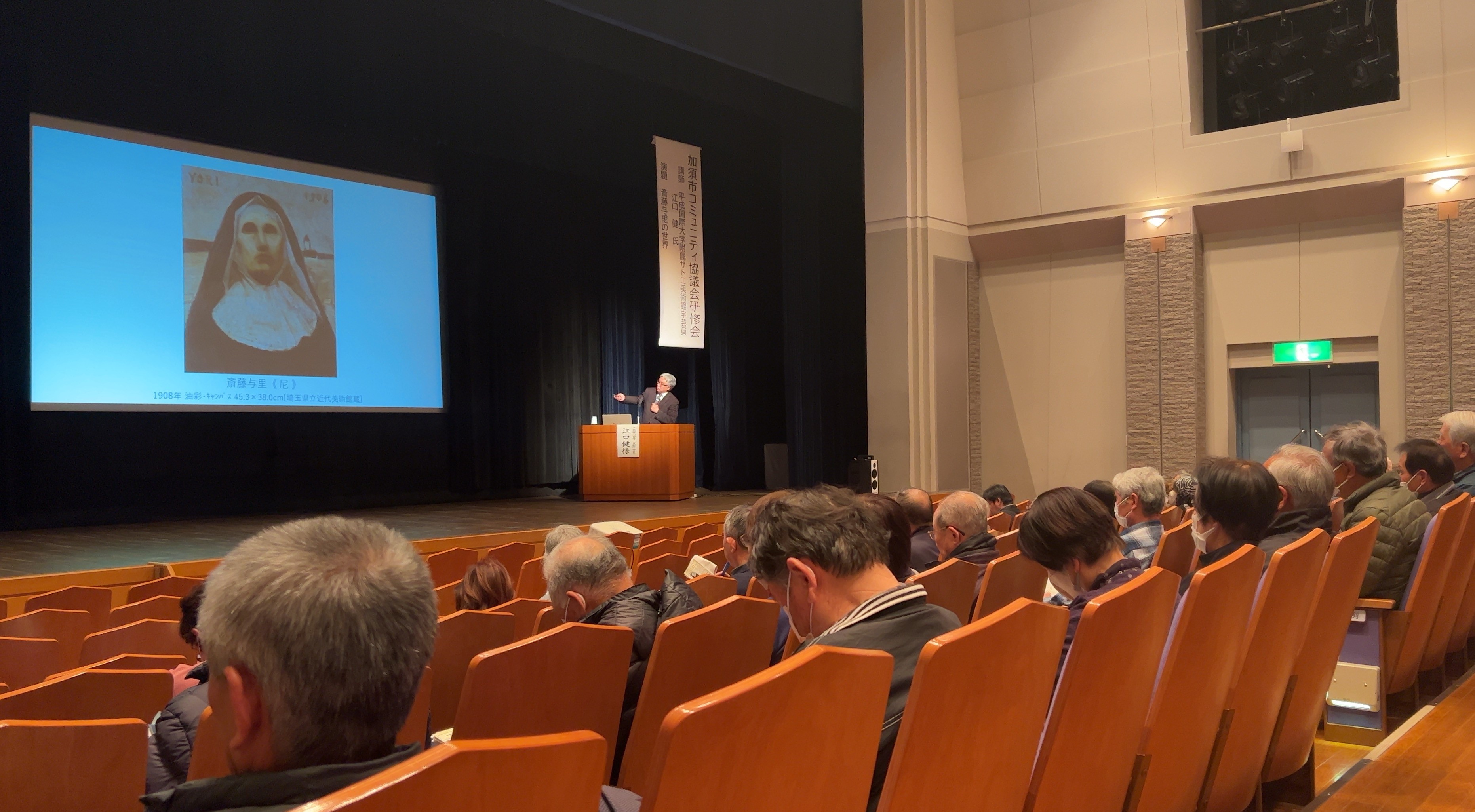 3月22日、令和5年度加須市コミュニティ協議会研修会がパストラルかぞ小ホールにて開催され、平成国際大学附属サトエ美術館の江口健学芸員が『斎藤与里の世界』と題し講演を行いました。本研修会には加須市コミュニティ協議会の役員および会員等の約100名が参加いたしました。江口学芸員は、郷土・加須市の偉人である画家・斎藤与里についての講演を行った後、同施設内の展示室にて開催されている『斎藤与里展』会場においても鑑賞解説を行いました。