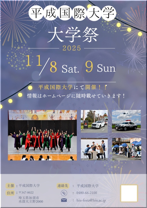 平成国際大学では、令和7年(2025年)11月8日(土)、11月9日(日)に大学祭を開催いたします。 詳しい情報につきましては、大学祭ホームページにて随時お知らせいたします。