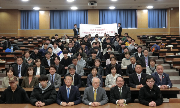 12月16日(火)13時30分~16時に「令和7年度 加須市議会議員と平成国際大学学生との意見交換会」が平成国際大学にて開催され、加須市議会議員全24名(欠席3名)と、法学部3~4年の学生52名が意見交換を行いました。