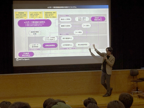 『eスポーツの興行と発展』をテーマに、国内のeスポーツビジネスをけん引しているNTTe-Sportsの事例をご紹介いただき、これまでの講義では不十分だったeスポーツの社会的価値をさまざまな実例に基づきご講義いただきました。