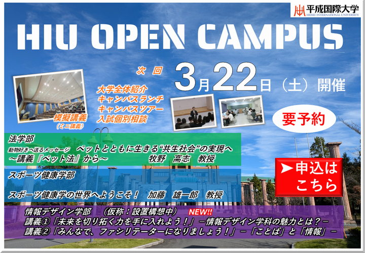 平成国際大学では、3月22日(土)にオープンキャンパスを実施します。