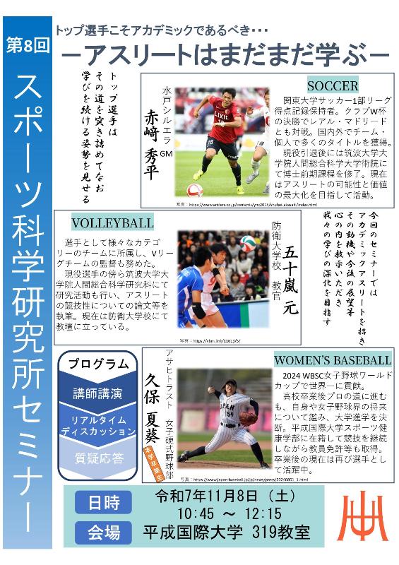 平成国際大学 スポーツ科学研究所では、第8回セミナー「トップ選手こそアカデミックであるべき ~アスリートはまだまだ学ぶ~」を開催します。