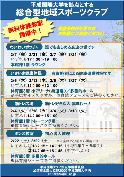 平成国際大学を拠点とする総合型地域スポーツクラブが、令和7年(2025年)4月に任意団体として発足します。 加須市のスポーツを通じた健康で活力あるまちづくりのため、スポーツ等の通常教室およびスポーツ・健康に関するイベントを開催します。 発足に先立ち、2月・3月に無料体験教室(わいわいボッチャ/いきいき健康体操/筋トレ広場/ダンス教室)を実施しますのでお知らせいたします。