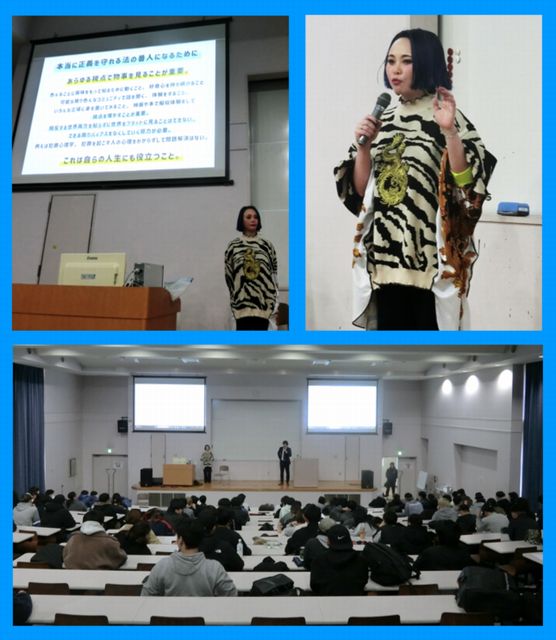 令和7年(2025年)1月27日(月)、牧野高志教授担当「生命と法(ペット法)」の講義において、社会彫刻家/ヴィーガンディレクターの 山中 安澄 氏をお招きし、講演会を実施しました。山中氏は、動物福祉の観点からヴィーガン活動に取り組み、マスメディア等で活躍されています。学生たちは、講義とは違った観点から「動物の福祉」を学ぶことができました。また、山中氏は、学生の将来に向けた方向性について、熱心に語っていただき、学生たちは真剣に耳を傾けていました。