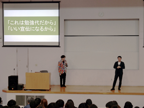 ゲストとして、お笑いコンビであるオシエルズの矢島ノブ雄さんと野村真之介さん、連合のフェアワーク推進局の皆様をお迎えしました。司会は、法学部の小林大祐准教授(労働法)が担当しました。